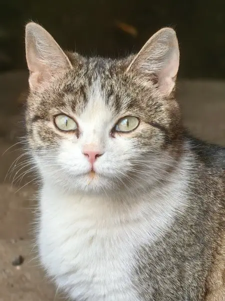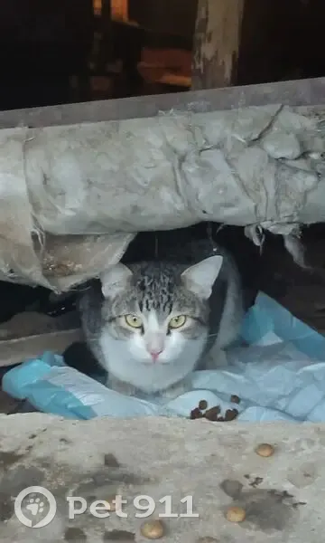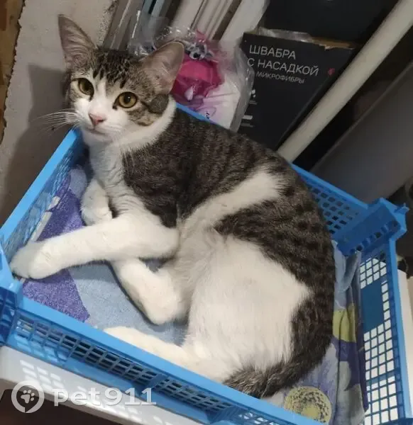 Возраст около 2 лет, крупный, отъевшийся, кастрированный. Цвет холодный серый в полоску с белой шерсткой на мордочке, лапах, животе, бедрах. Гладкошерстный. Глаза большие жёлтые, нос розовый. Пугливый, не любит резких и звонких звуков.