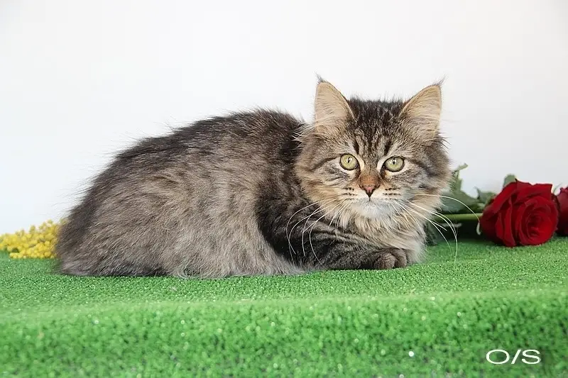 Коричнево-серый. Пушистый. Полосатый. Глаза зеленые. Ласковый, дружелюбный.
