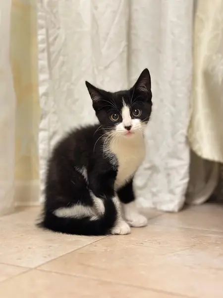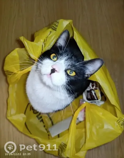 Кот кастрированный .Окрас черно-белый. Тело черное, грудка и пузико белые. На лапках белые гольфики, не симметричные . Особая примена черное пятно на розовом носу