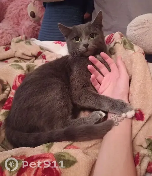 Серая кошка, на передней и на задних лапках белые пятнышки, на шее белое пятно и на животике... Порода помесь русской голубой. В руки не идёт, пугливая, немного диковатая.