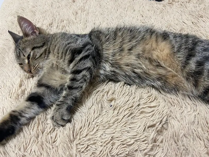 Кот-подросток, очень активный и игривый мальчик, немного боится чужих. Коричневый полосатик, острые когти и зубы, среднего тело-сложения. Выпал с балкона, возможно имеет внешние травмы и/или переломы. От страха скорее всего забежал в чужой подъезд.
