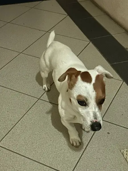 Белый окрас с коричными пятнышками, на шее был номерник.
