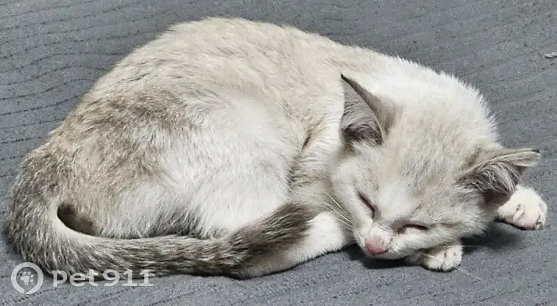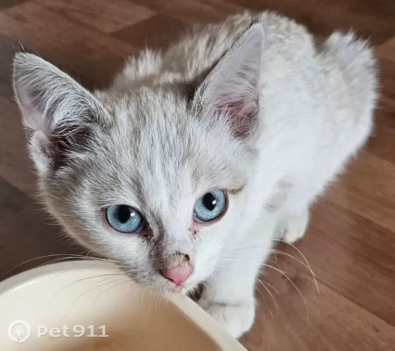 (девочка) белый котенок с сероватыми ушами и хвостом. На вид около 3 месяцев, голубые глаза, ласковая, приучена к лотку. При обнаружении у животного была небольшая ранка на животе (сейчас обработана). Котенок активный, игривый, хорошо идет на контакт, ласковая любит когда гладят, была голодная. Если вы являетесь хозяевами или знаете, кому может принадлежать кошка, пожалуйста, свяжитесь с нами.