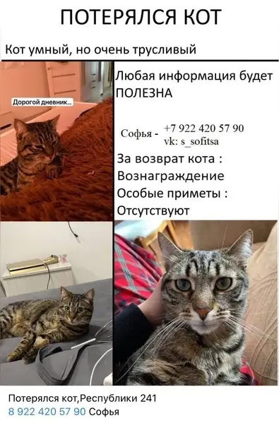Стояла у магазина жк малахово, запрыгнула в машину и не хотела уходить, ждала около часа хозяев но так никто и не пришел. Кошечка ухоженная , видно что домашняя.