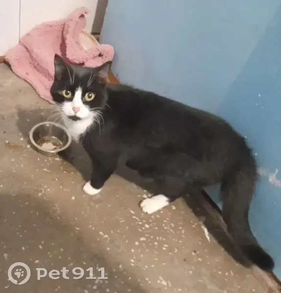 Кошечка впервые замечена в подъезде дома 17.10.2025, затем пропадала на некоторое время Ориентировочно с начала ноября живёт в щели стены в подъезде. Мы её подкармливаем. Внешность:черно-белый окрас, белые тапочки на передних и задних лапках, носик розовый, чёрная нижняя челюсть, глазки жёлтые, пушистый чёрный хвост