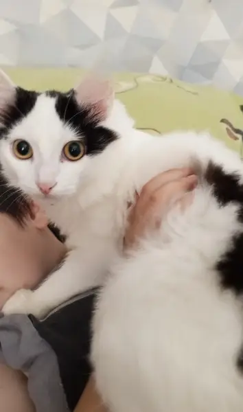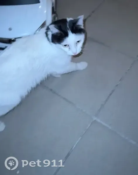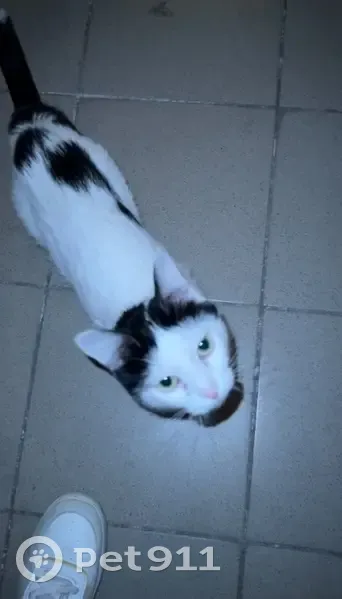 Не могу определить пол животного издалека (стараюсь не прикасаться из-за аллергии). Кошка исхудала. Держится особнячком, но если не видит опасности, проявляет внимание и интерес, мурчит и хочет ластиться. Белая шерсть на спинке испачкана, глаза тоже грязные. Имеет чёрные пятна на шерсти и красивый чёрный длинный хвост с белым кончиком. Прячется под колясками на этажах в подъезде № 3
