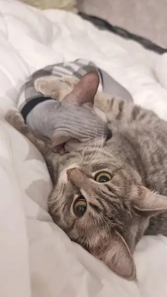Нашлась кошечка небольших размеров серого окраса в Верхнему Бору. Прибилась к ним 31 декабря, думаю, что сбежала откуда-то во время салютов. Очень тихая, спокойная, не царапается.Животик округлен, возможно беременная.