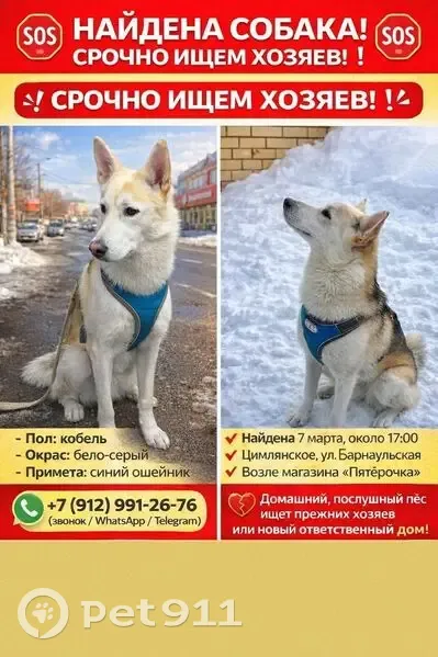 Перебегала дорогу со стороны Затюменского Эко-парка, нашли у магазина Пятерочка. Кобель, бело-серый окрас, синий спортивный ошейник. Собака знает команды.