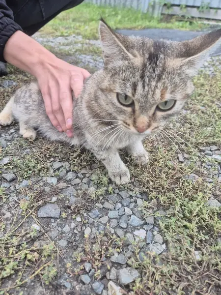пятнистая, животик очень выраженно пятнистый, на ушкак что то по типу кисточек, тянется к людям, ласковая откликается на кличку Мура, глаза очень умные, обожает играть и гулять
