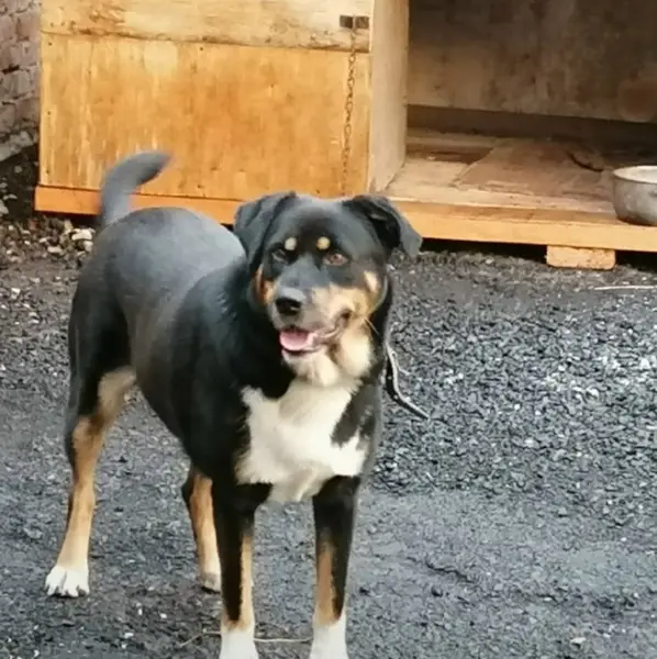 собака не большая, знает команды, бегает за всеми кто позовет.