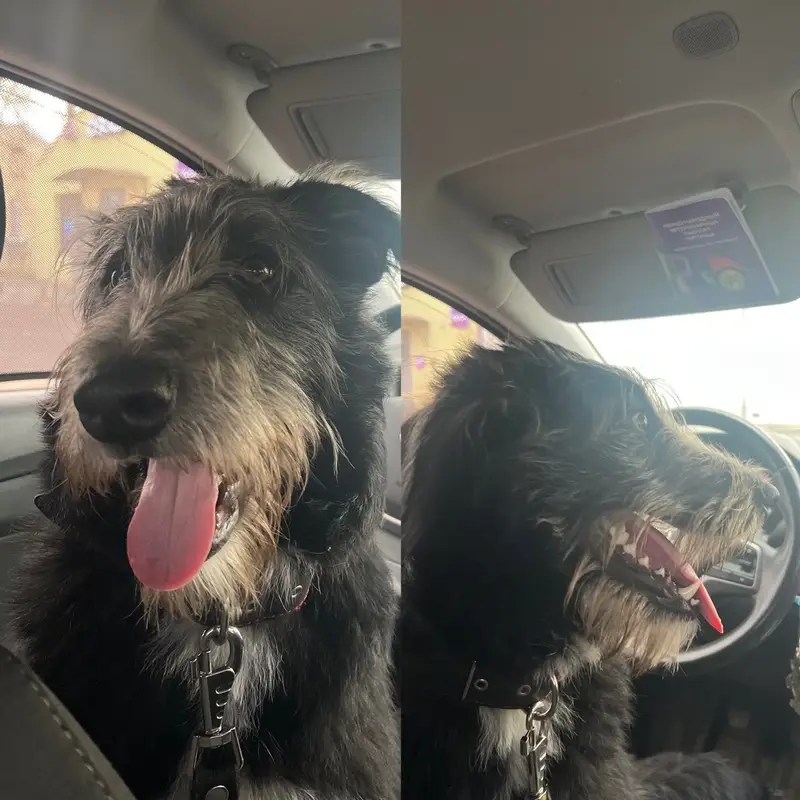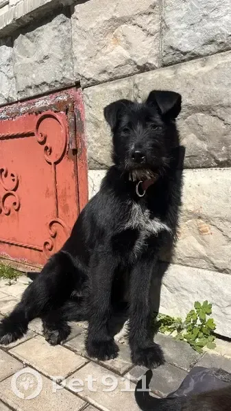 Черная шерсть, похожа на ритеншнауцера. Белые патныщки на груди, у носика и кончик хвоста