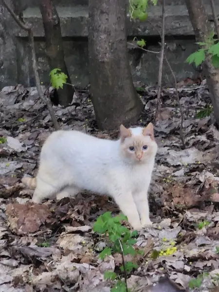 Белый со светло-рыжей "маской" на морде, уши тоже светло-рыжие, на хвосте светло-рыжие полоски, глаза голубые, был в коричневом ошейнике. Людей боится.