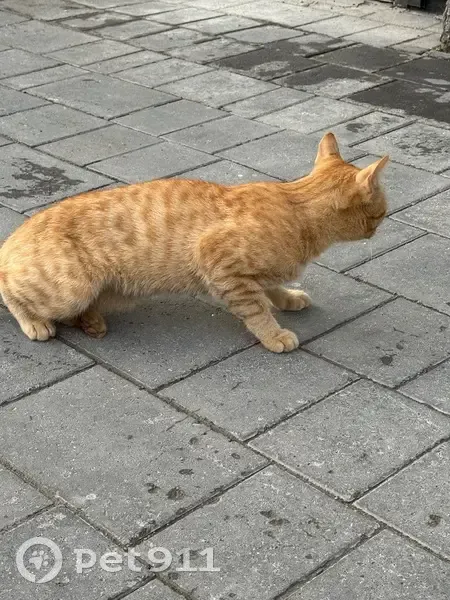 Рыжий кот, тело окрас «пятна», а хвост полосатый. Нашли на Сагита Агиша 19, возле студии цветов Pushkin flowers. Глаза тоже желто-рыжие. Левое ушко меньше правого. На вид 1-3 года