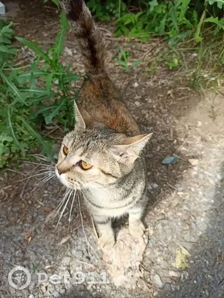 На пересечении улиц Менделеева и Большая Московская, в кустах справа появилась неделю назад ухоженная кошка, на вид домашняя. Все время пряталась в кустах, боялась. 29.06.25 выбежала и отчаянно просила помощи, была настолько голодная, что буквально вырывала еду из рук. Очень красивая кошка с невероятными янтарными глазами, с хорошей пятнистой шерсткой, ласковая. На вид полгода-год.