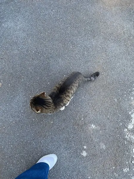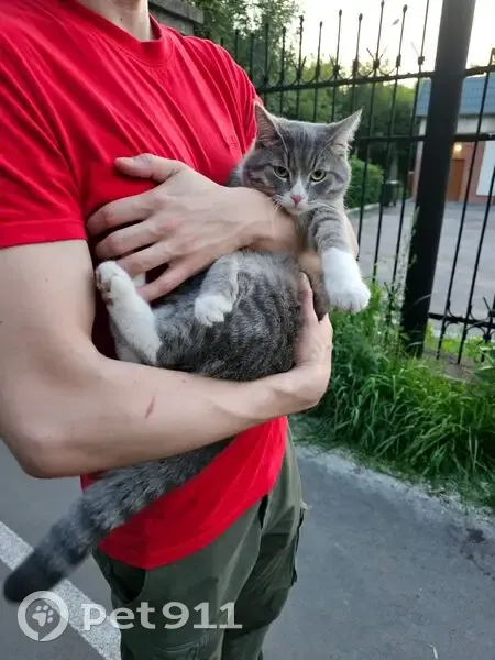 Полосатый серый с белым кот, молодой, ласковый, людей не боится, охотно идёт на руки. Найден на лесной тропе уфимское ожерелье в районе глазного центра им.Мулдашева на зорге. Пугается леса