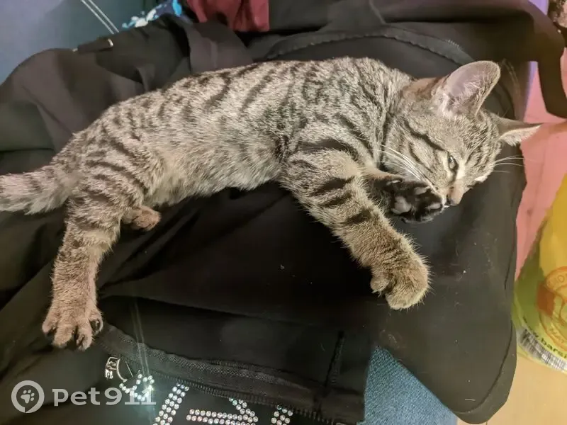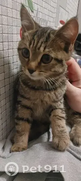 Котёнок, кошечка. Около 3х месяцев. Окрас - азиатская табби. Ласковая, компанейская. Тарахтит как маленький трактор. Глаза ярко-оранжевые, очень необычный оттенок. Нашли на улице Первомайской возле Бургер Кинга.