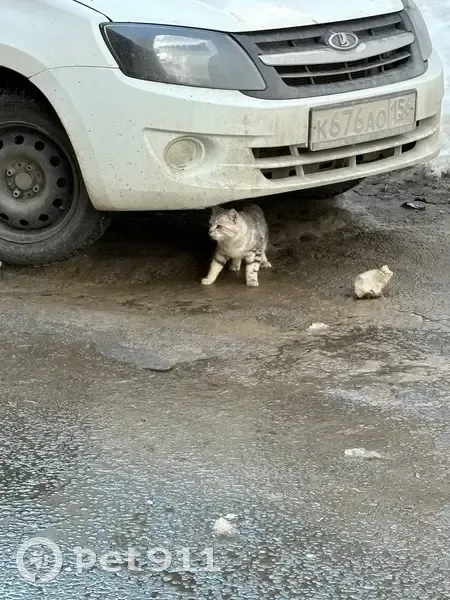 проходили мимо общежития 2,слышим мяукает сильно под машиной,кот мраморного окраса видно ,что домашний,ухоженный