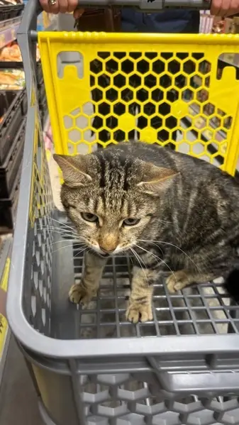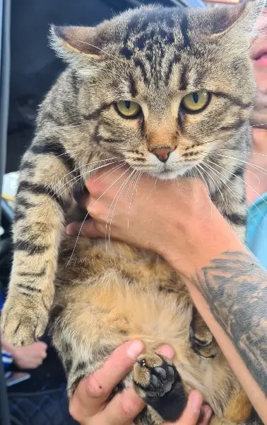 Окрас серый полосатый (Табби), спокойный, чистый. Нашелся у окна центра шорт-трека.