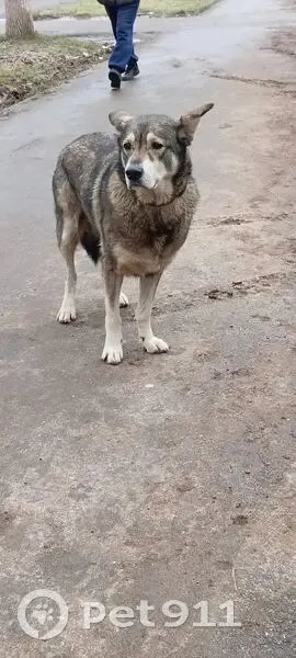 Собака бело-коричневого окраса, с синим ошейником на шее, выглядит напуганной и растерянной, скулит. Как будто ищет хозяина, ходит озирается. Найдена по адресу Гафури 70, с места пока не уходит