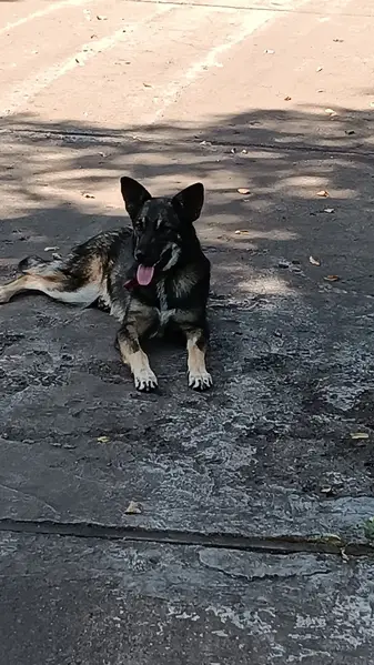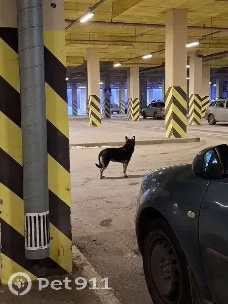 Собака с черной спиной, светлыми лапами и животом, светлым носом. На ней ошейник с красным адресником-сердечком. Близко подойти не даёт, узнать номер хозяина не удалось.
