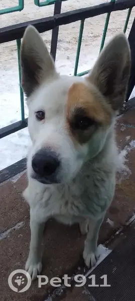 На завод Ремстройдормаш прибилась молодая сука. Белая, пятно на левом глазе, ушах и у основания хвоста. Похожа на лайку. Знает команды. Людей не боится.