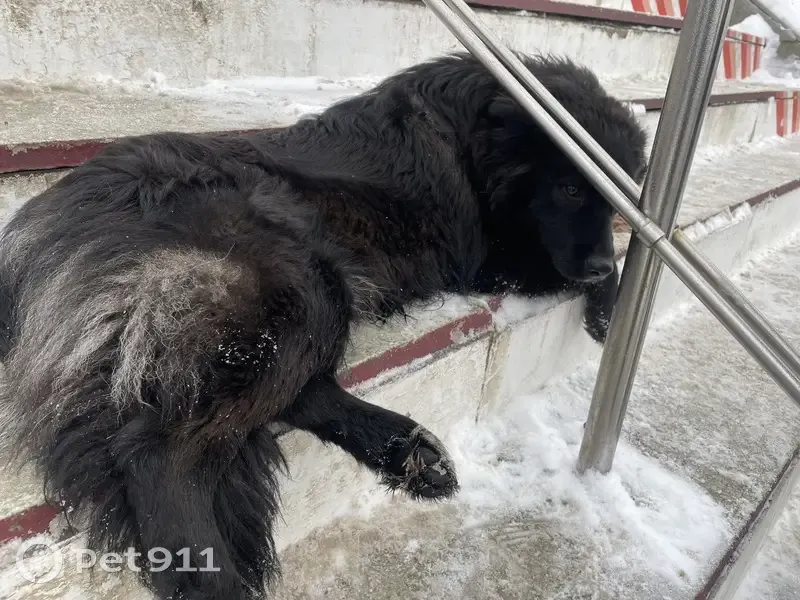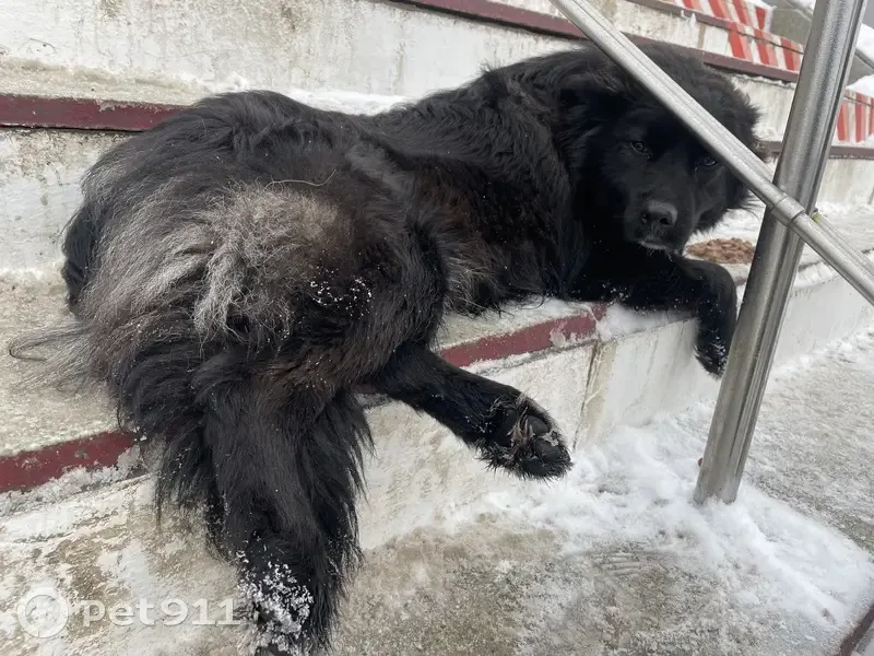 Лежит на лестнице на подъеме в тц планета с остановки тужиловка. Встать не может, возможно сбила машина, задние лапы поднять не может. Не агрессивная, на контакт идет. На шее ошейник, будто сорвалась с цепи