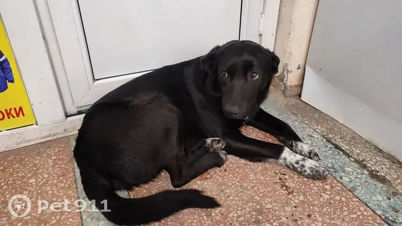 Пёсик черного цвета с белыми лапами, есть ошейник кожаный светло коричневый, размеров меньше лабрадора, фенотип немного похож на лабрадора, дворняга. Грелся в магазине