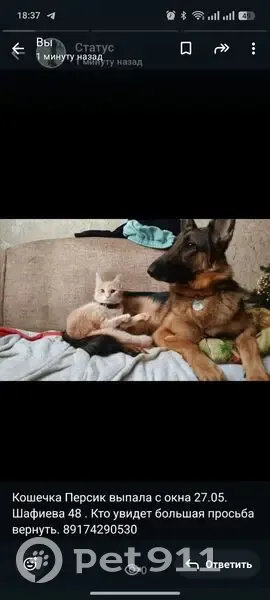 Кошечка чуть больше года, стерилизованная, выпала с окна 1 этажа. Светло- рыжая (персиковая), на улице первый раз возможно где то в подъезде. Выпала убежала в кусты у аптеки