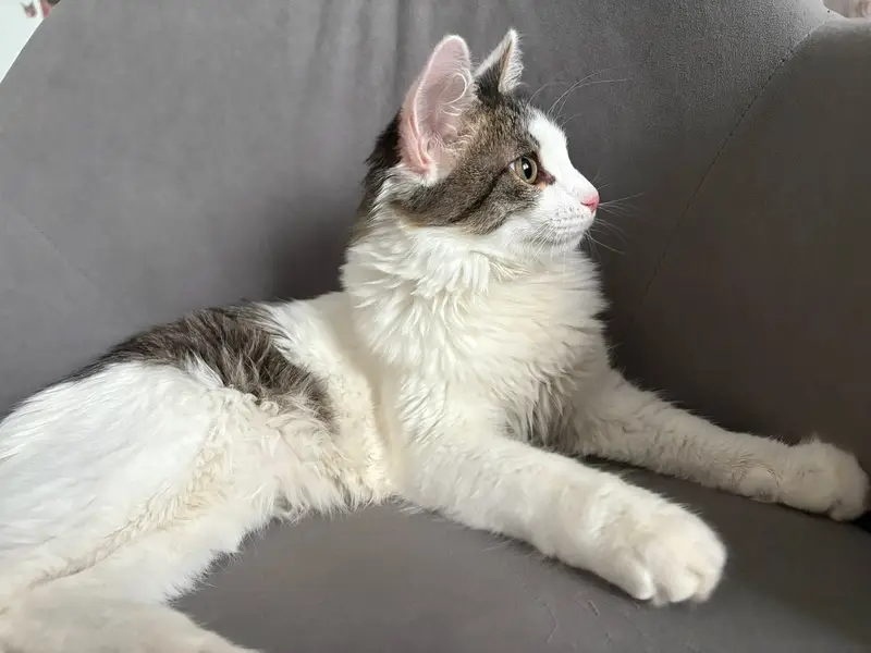 Голубые глаза, бело-коричневая шерсть. Пугливый. Раньше жил в частном доме, поэтому просился на улицу. Периодически выпускали на самовыгул в подвал жилого дома.