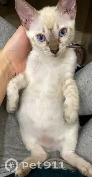 Белая со светлыми пятнами , светло голубыми глазами.Очень трусливая. Ласковая , но когда боится выпускает ногти . Игривая бенгалка.Выпала ночью из окна балкона 5 этажа, пропажу уже обнаружили утром .Возраст Практически 3 месяца.