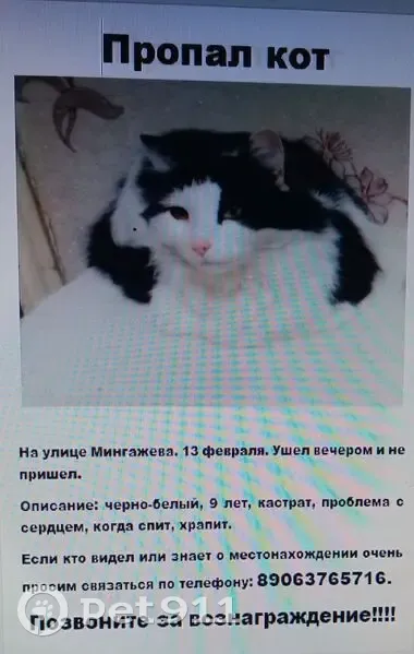 Пропал кот, улица Мингажева, Уфа - черно-белый кастрат с проблемой сердца