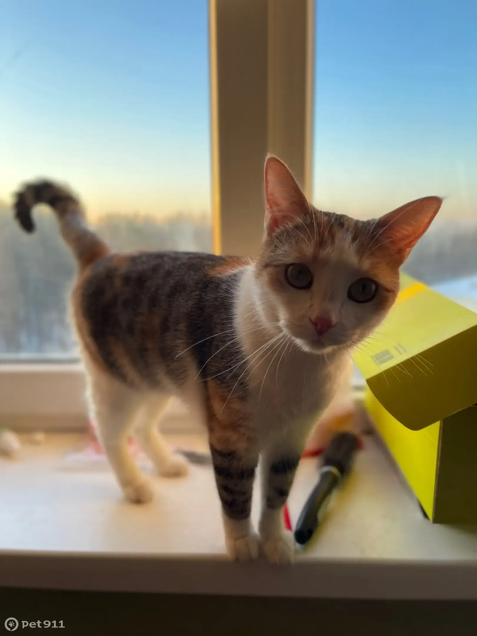 Зовут Тыгыдык, трехцветный окрас, очень ласковая, но боится всего, выбежала из открытой двери и не вернулась