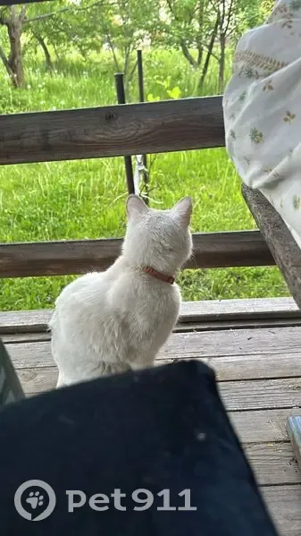 мужской пол,белый кот. на подбородке болячка, а на хвостике есть черная пятно.кот глухой. ошейник темно-золотистый. 7 июня отпустили гулять, так и не вернулся.