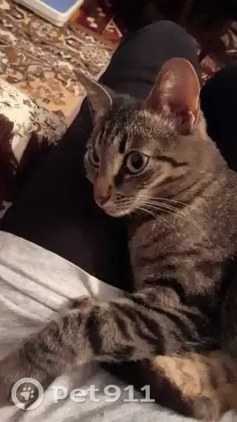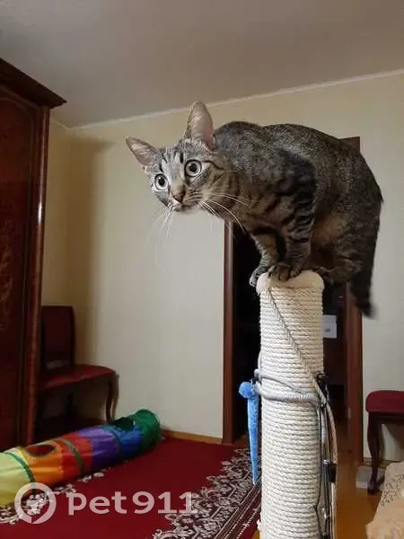Кошка, 2 года, вес 3 кг. Сложение стройное, уши крупные. Окрас полосатый (табби), шерсть серя с рыжеватыми подпалинами. Скорее всего, выпала с лоджии дома по ул. Бикбая, 14
