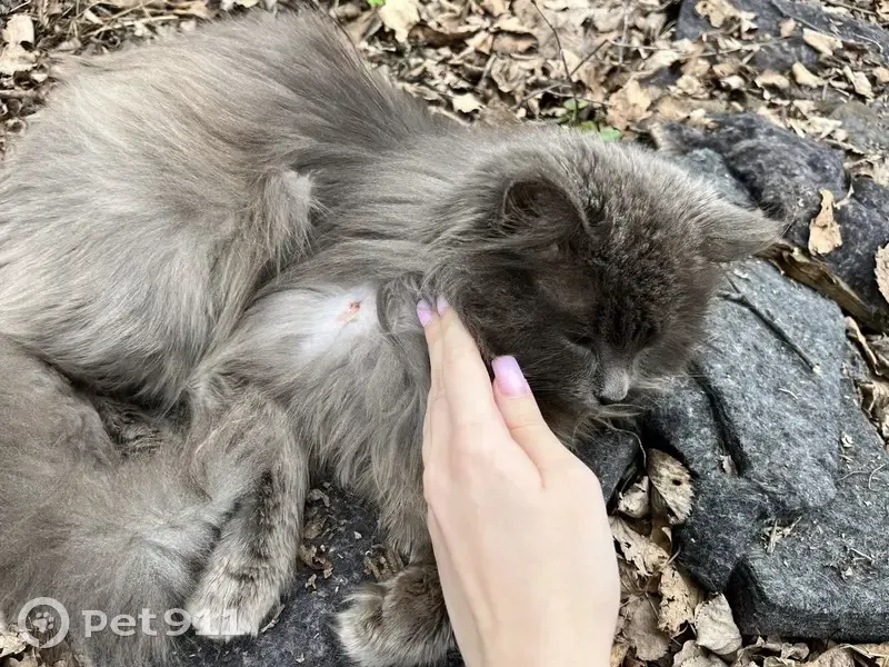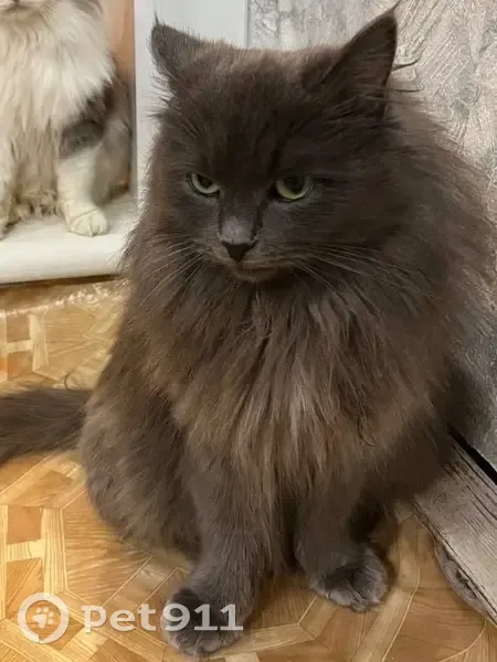 Серый, присутствует выгоревшая рыжая шерсть Ранена правая передняя лапа, из-за чего она половина без шерсти Были до пропажи в клинике, там убирали колтуны, поэтому немного лысовато на подбородке-шее