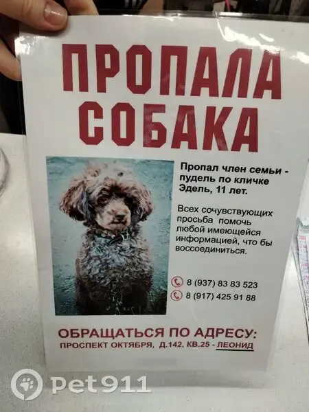Здравствуйте, пропал пёсик по кличке Эдель, 11 лет, порода пудель, оксас светло-коричневый, глаза карие(возможно увезли родственники, хозяина дома небыло) , вдруг кто видел или подобрал. Просьба связаться с хозяином по номеру в объявлении.