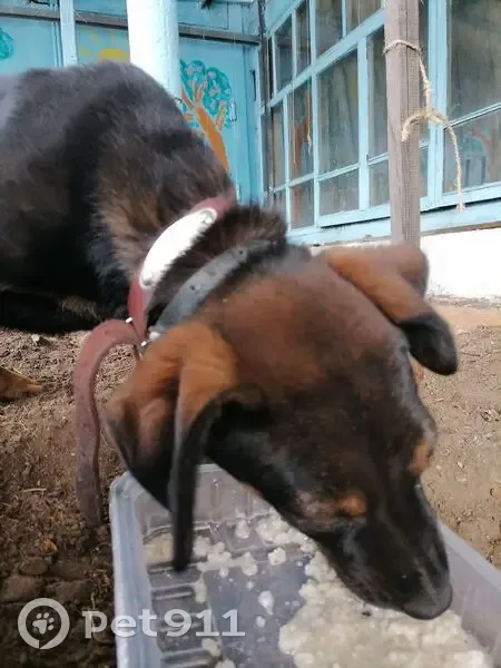 Черный с коричневыми пятнами, бегал за всеми проходящими людьми