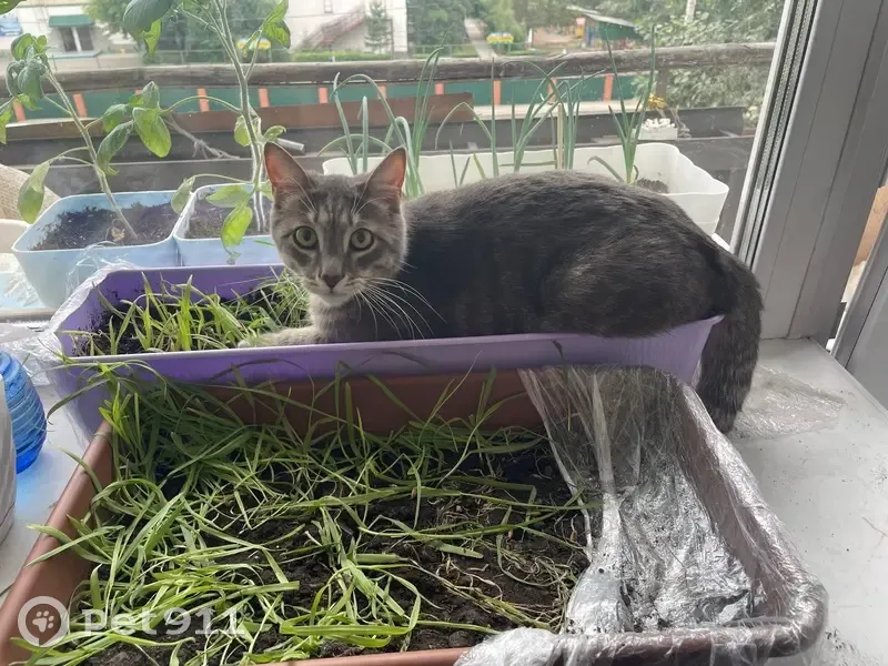 Упал с балкона третьего этажа. На вид годик, есть небольшое висящее пузико. Мяукает громко, пугливый, шерсть гладкая, грудка песочная, сам серый в полоску, глаза желто-коричневые. Внизу спины вначале хвоста серое пятно от линяющей шерсти, как клочок.