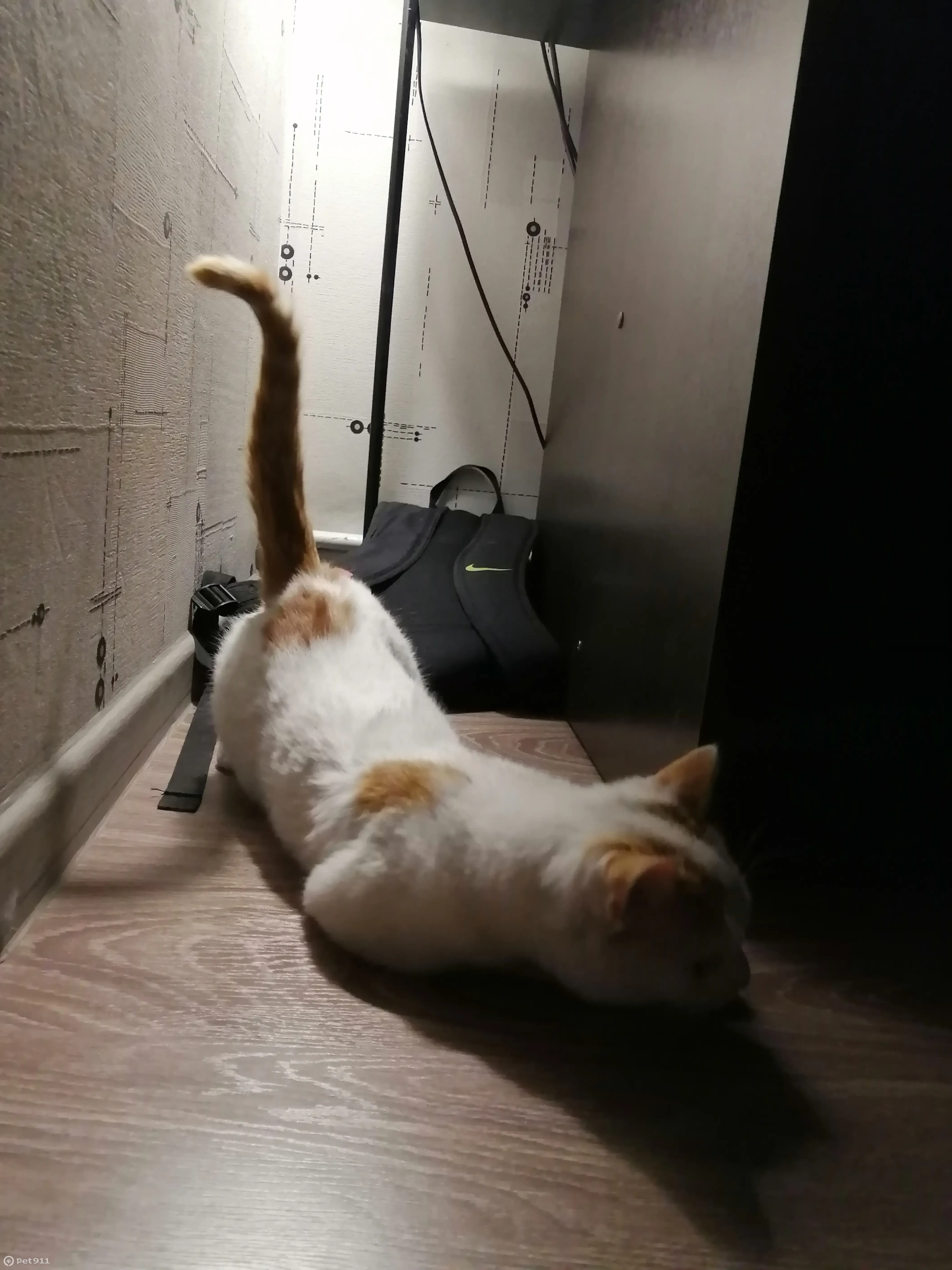 Мальчик, белый с рыжим хвостом и рыжими ушками. Есть два рыжих пятна: на крупе и на спине. Выгуливали и убежал. Не поймали.