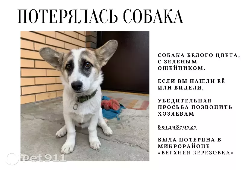Дворняжка, мальчик белый окрас (на мордочке пятна). У него зелёный ошейник, надпись «police dog». Выбежал из ограды 14.09 в 8 утра.