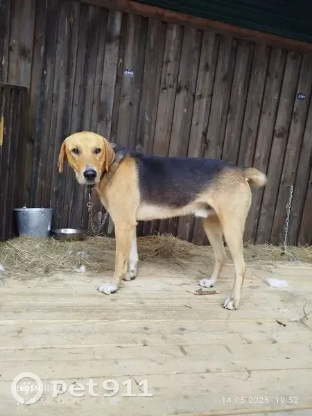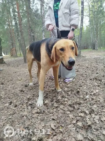 Пришёл утром 12 мая 2025 к нам на базу в Сивцево (Гусь-Хрустальный район). Очень контактный, добрый, ласковый и послушный. Ладит с собаками, абсолютно не конфликтный. Сняли с него клещей, обработали ранки. Похож на русскую гончую. Возможно убежал с охоты, был без ошейника. Следа от ошейника нет. Клеймо не нашли. Проверить чип возможности нет. Не кастрат. Зубы без налёта, видимо очень молодой пёс. Оставили пока у себя, ищем старых хозяев.