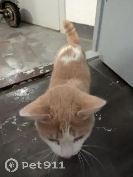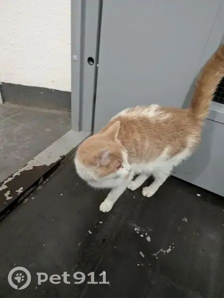 Рыжий кот, низ белый, хвост полосатый. Забегает в подъезд, ластится к людям, пытается зайти в квартиры.
