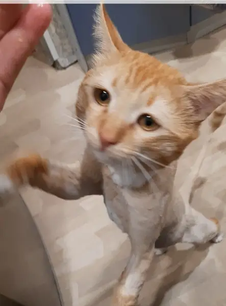 Рыжий кот, имеет веснушки на слизистых, кастрирован, ласковый, худой(позвоночник можно потрогать и торчат рёбра), на шее фиолетовый ошейник с колокольчиком