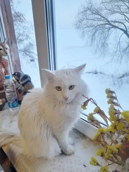 Белая кошка, молодая ,ласковая , со стриженными когтями