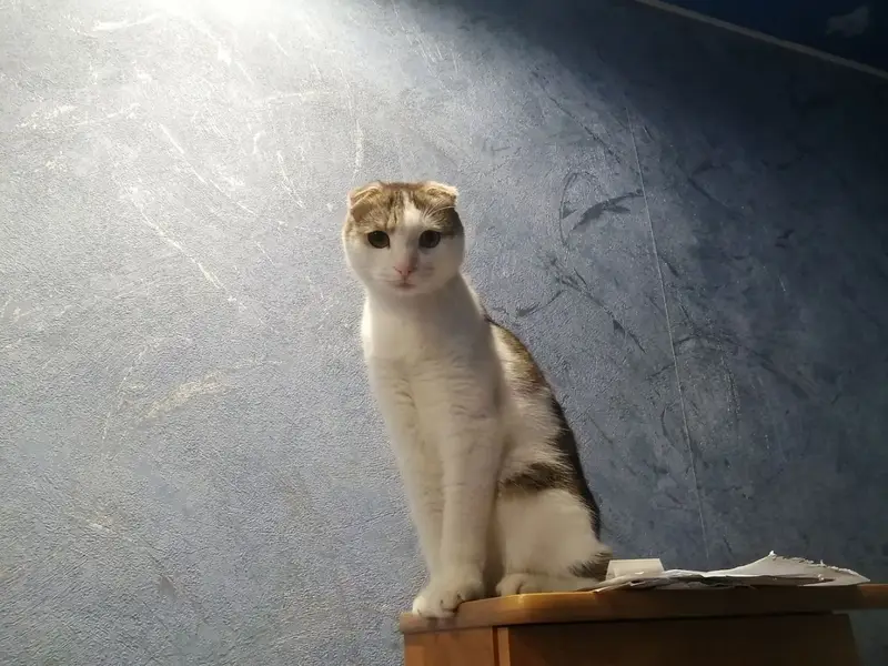 Кот, бело-коричневый окрас, сидел напуганный в подъезде, худой, ласковый.