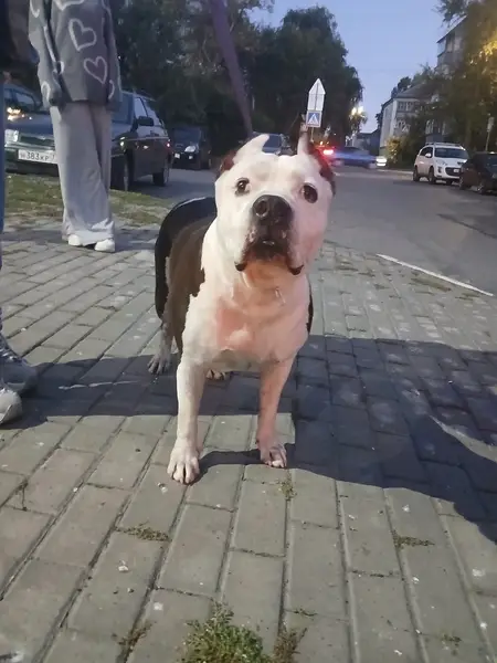 стаффордширский терьер,кобель , не кастрирован; на вид года 4. Не агрессивный, очень ласковый и дружелюбный. Знает некоторые команды. Квартиру знает. Жил не на улице
