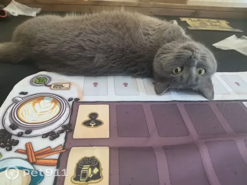 Небольшая серая кошка с белой грудкой. Особые предметы: отсутствие шерсти на правой щеке. Похожа на британскую, метис