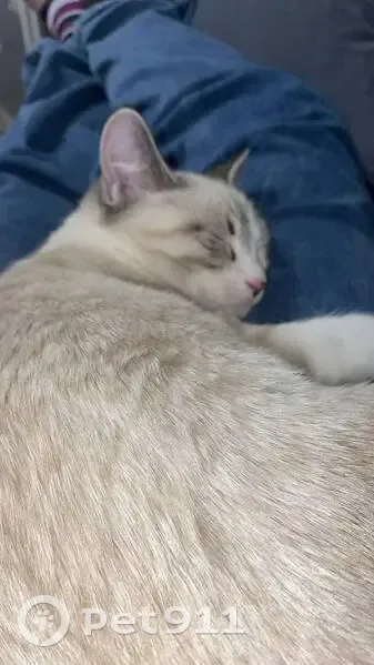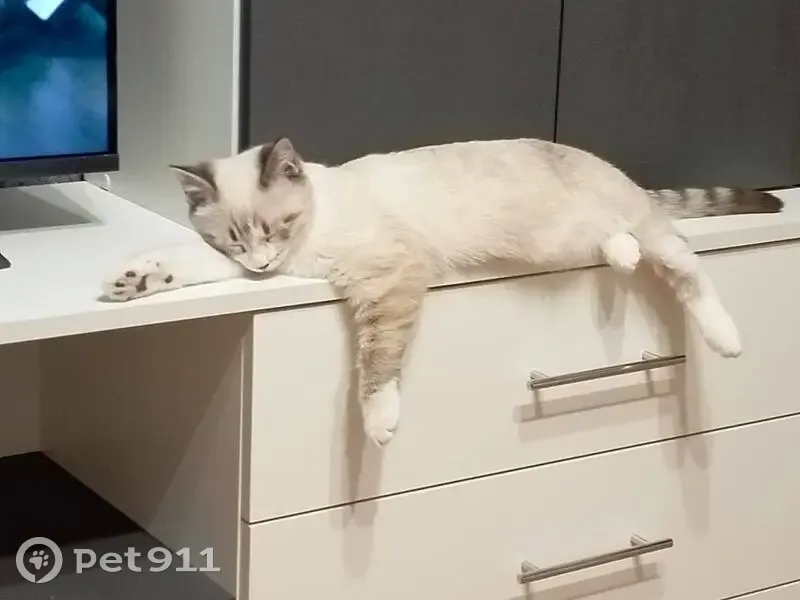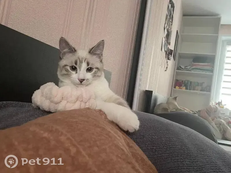 Имеет пятнышко у глаз, очень ласковый. окрасок - бело-серый, хвост полностью черный.