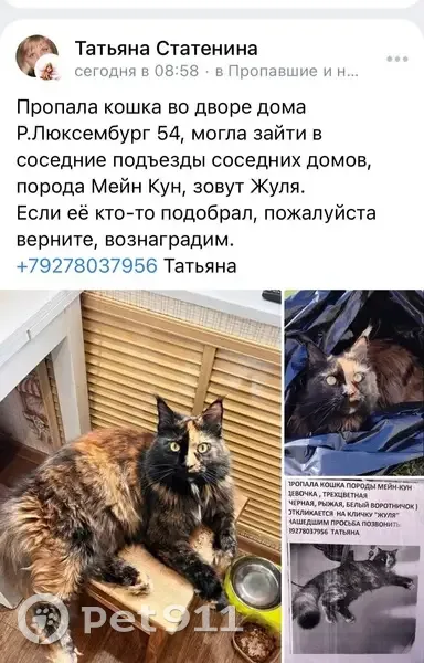 Можете пожалуйста помочь, по возможности распространить Пропала кошка породы Мейн-кун, зовут «Жуля» Кошка живёт в квартире и гуляет во дворе домов по адресу Розы Люксембург 54 и 52, все жильцы её знаю. Рядом места с большим количеством людей «Парк Юности» и 29 школы. Возможно что то случилось, запугали и потерялась или кто то случайно забрал домой, кошка красивая и может кому то понравилась. Помогите пожалуйста найти, ребёнок очень сильно переживает Сама выходит и возвращается с улицы домой, но со вчерашнего дня, с 9 утра, её никто не видел Номер для связи +79374538787