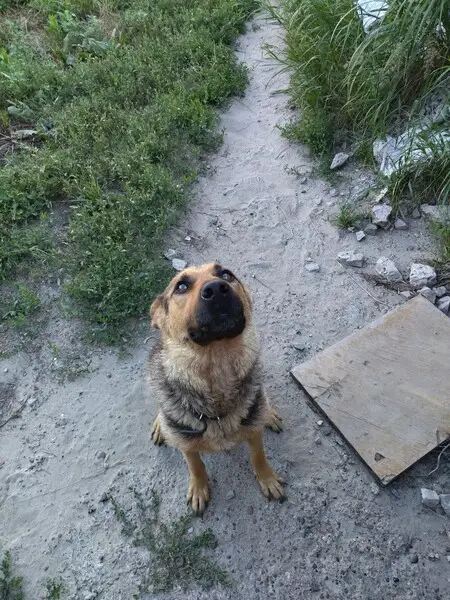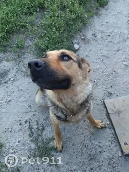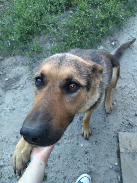 Немецкая овчарка, примерно 40 кг. С людьми ласковая, любит прыгать и садиться рядом, чтобы её погладили. Любит смотреть ласковым внимательным взглядом. Но она очень пуглива и может метаться из стороны в сторону и прятаться куда-либо.